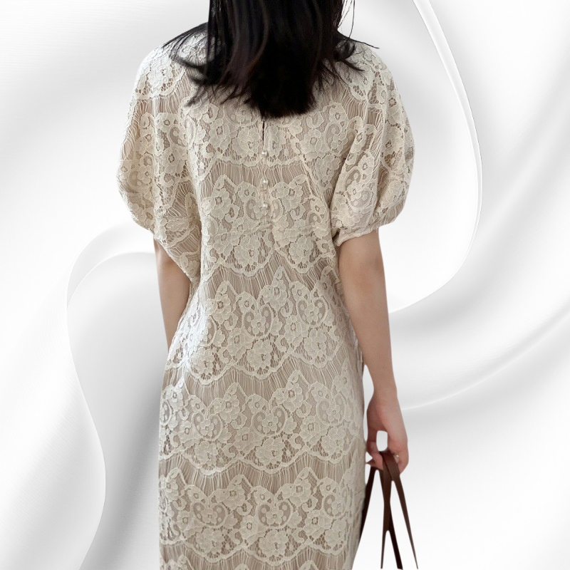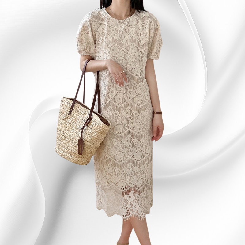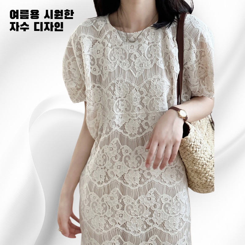 여름용 자수 원피스, 라운드넥 디자인과 미디 스커트 기장. 시원한 착용감, 여성스러운 실루엣, 데일리룩과 휴양지룩 모두 활용 가능.