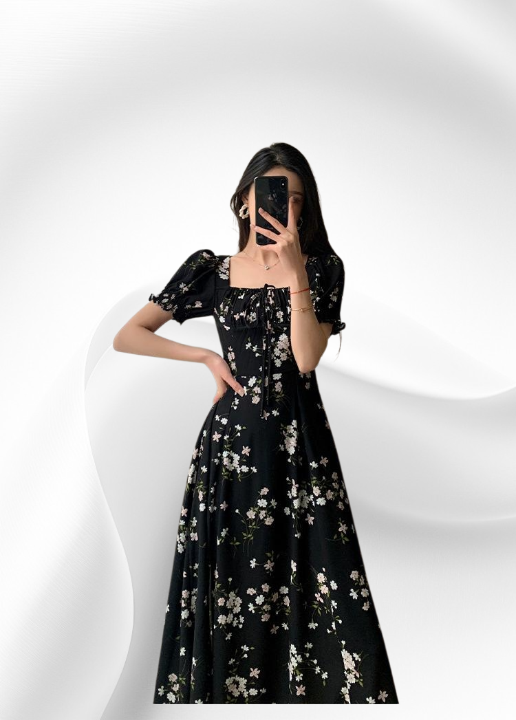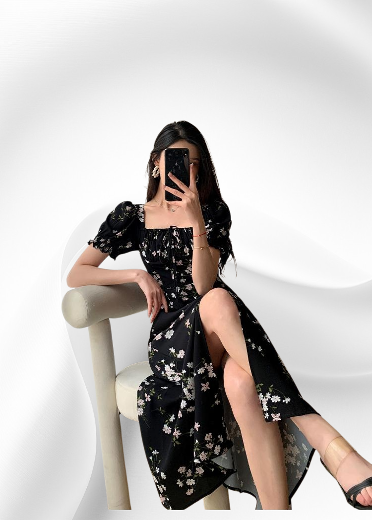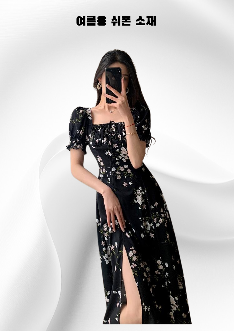 여름용 쉬폰 소재, 트임 디테일, 롱 기장감, 반팔 디자인, 플라워 패턴, 미디 스커트로 시원하고 편안한 착용감 제공